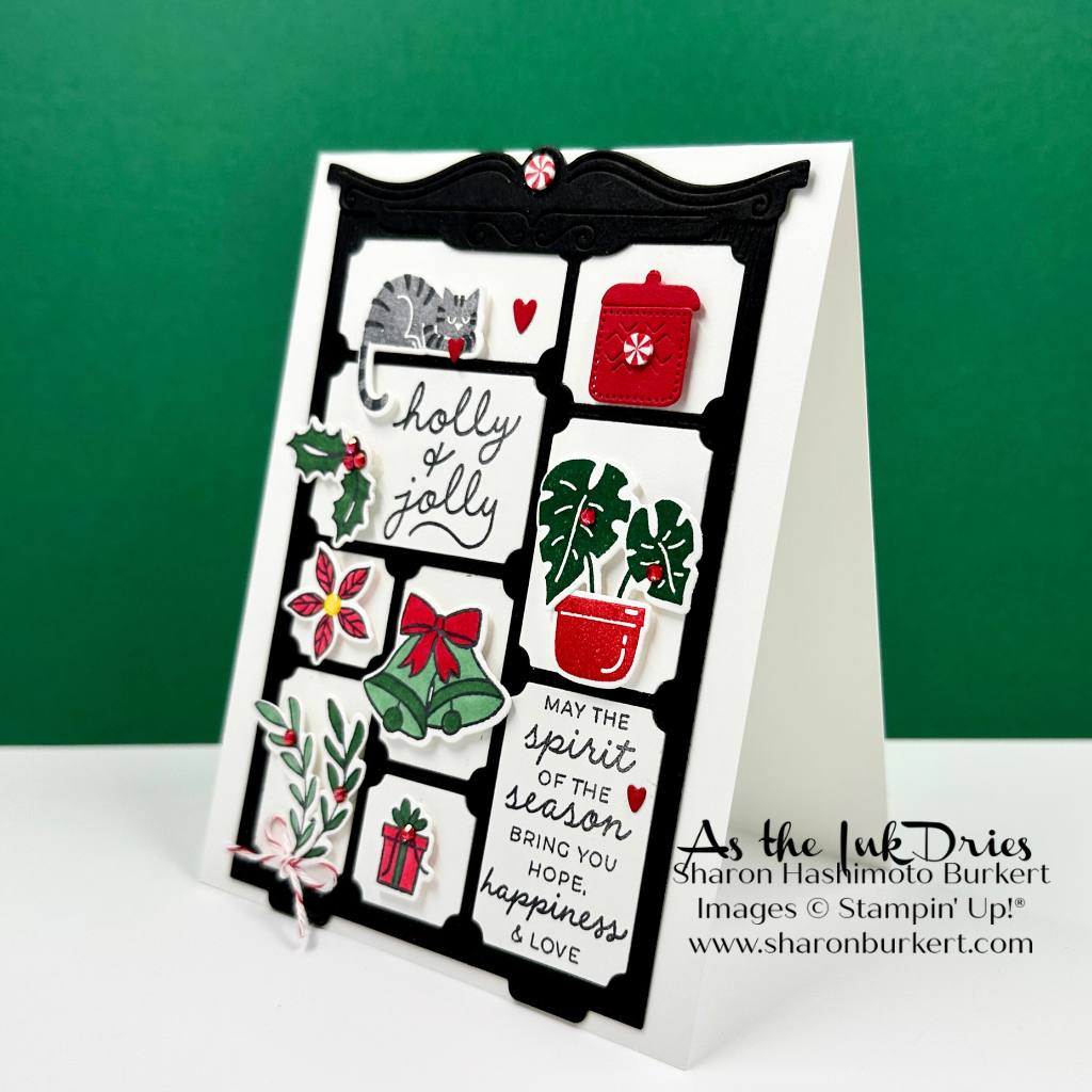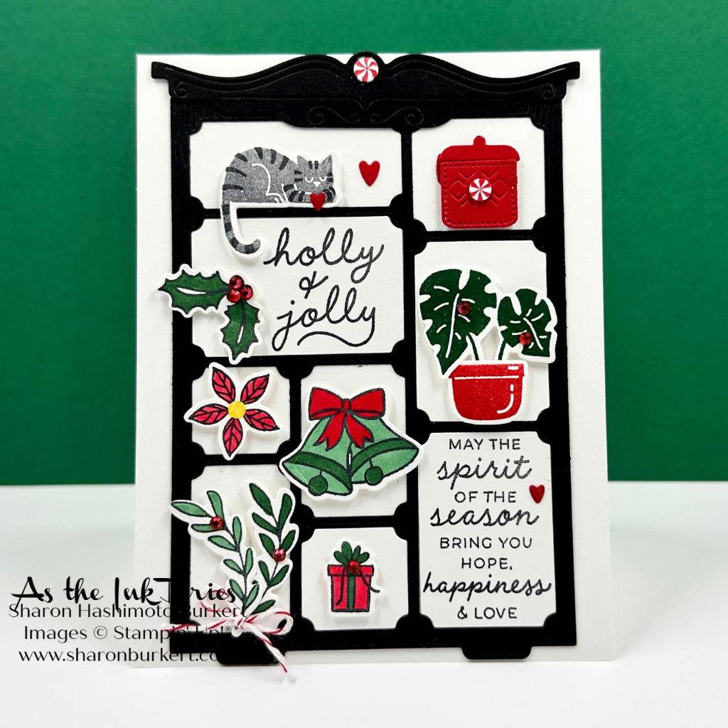 I have been having do much fun with the On Display bundle (November 2025 Online Exclusive). It reminds me of playing with a doll house. I enjoy figuring out what goes where and how to make it all fit together. For today’s card I primarily used the Jolly Holly bundle and the On Display bundle.