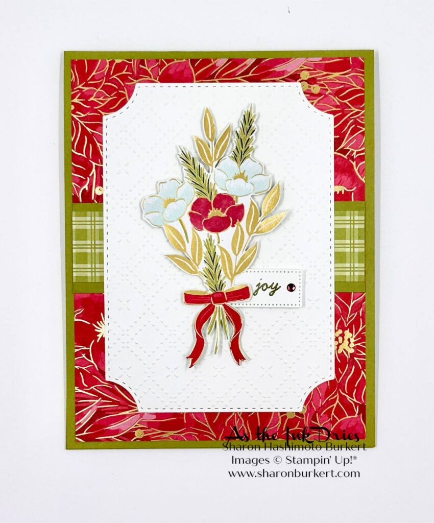 - Bouquet cut from the Traditions of Christmas Specialty DSP. The center flower was colored using Cherry Cobbler Stampin’ Blends.