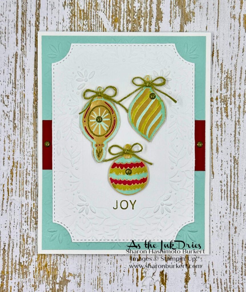 - Ornaments colored using Cherry Cobbler, Pool Party, and Old Olive Stampin’ Blends.