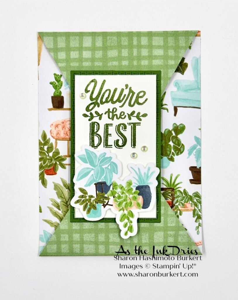 The card base was made using the Hobby Haven Specialty DSP. The Hobby Haven DSP comes with 2 sheets of pre-cut images and the cute plants are an example of the fun images. The Garden Green CS layer was created using the Textured Notes dies. The sentiment is from the Creative Haven stamp set inked in Garden Green ink. The embellishments are from the Holographic Resin Dots.