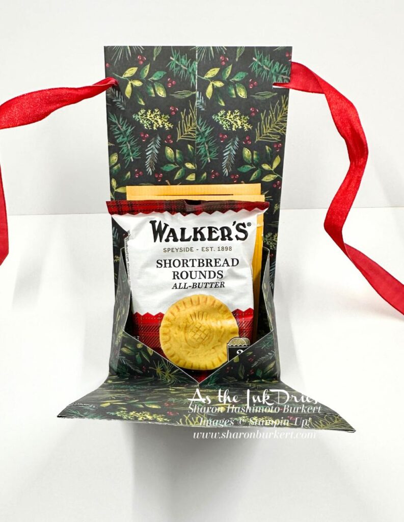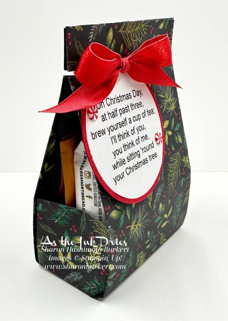 Inside I have 3 tea bags and some individually wrapped shortbread cookies, a perfect little afternoon tea nibble. I will have a short video of how to make this treat bag but it is not quite ready. The basic measurements is 7″ x 12″ piece of DSP scored at 5″ and 7″ along the 12″ side and 1-3/4″ on either side (1-3/4″ and 5-1/4″) along the 7″ side. I also used the 2-3/8″ circle punch to cut out the poem and the #5 Stylish Shapes circle (#1 being the smallest circle). I used the Shiny Real Red Ribbon and the Real Red & White Adhesive-Backed Peppermints.