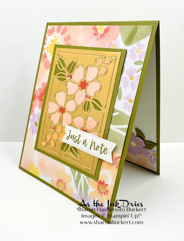 On the inside I added another flower and leaves from the Fragrant Layers dies and a strip of the Lovely & Beautiful Specialty DSP. For right now I am leaving the inside without a sentiment. This side view shows the shiny gold foil accents on the DSP. It is a very pretty pack of paper and the colors make me feel like spring is on its way.