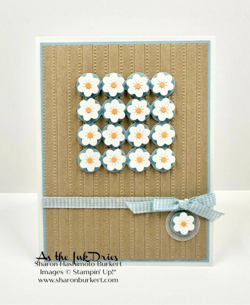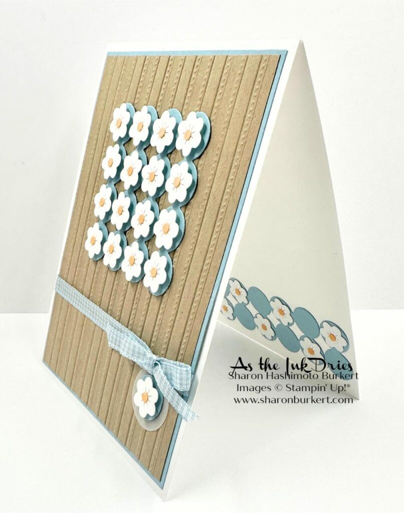 The Crumb Cake CS layer was embossed using the Lovely Stripes 3D Embossing Folder. TIP: If the folder is embossing too deeply and causing tearing lightly mist your CS with water before embossing. Behind the flowers is Balmy Blue CS cut using the Lovely Arrangements dies. CLICK HERE for cutting tips using the dies. The Peach Pie CS circles (flower centers) were punched using a punch from the Hole Punch Assortment. The sweet Balmy Blue Gingham Ribbon finishes off the front.