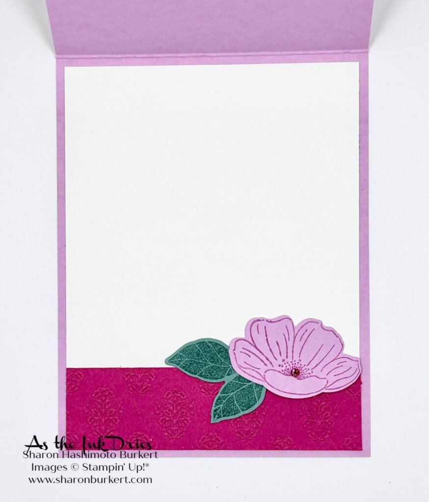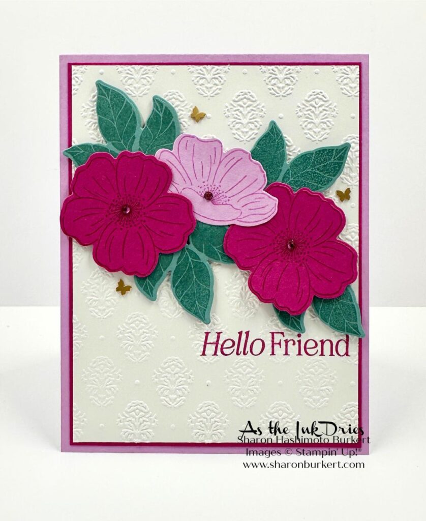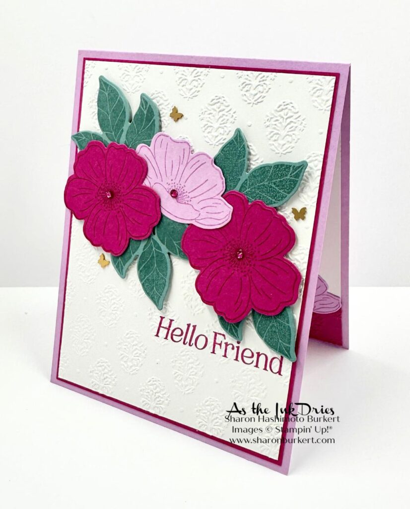 • Basic White CS 3-7/8″ x 5-1/8″ sentiment from the Lovely Arrangements set inked in Berry Burst ink and then embossed using the Damask Design Embossing folder.