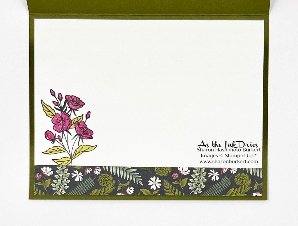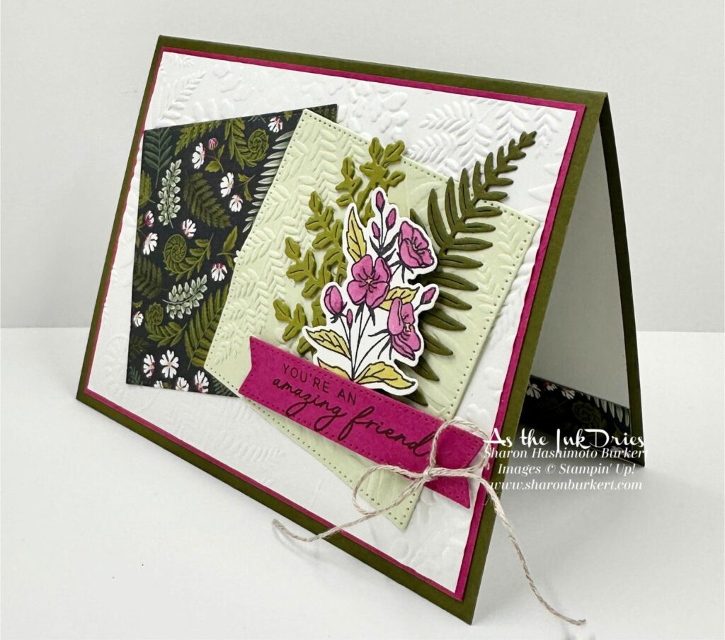 • Image from the Fern & Flora stamp set inked in Tuxedo Black Memento ink and colored using Berry Burst, Old Olive and Daffodil Delight Stampin’ Blends.